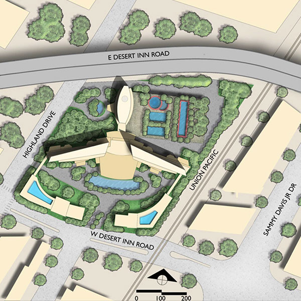 Two 55-story mixed-use resort towers located on the corner of Desert Inn Road and Highland Drive just steps away from the renowned Strip in Las Vegas, Nevada. The hotel program includes 3,500 guestroom keys, along with over 100,000 square feet of retail on the lower levels; 150,000 square feet of ballroom, meeting and event spaces; 50,000 square feet of spa, pool and recreational facilities, and several food and beverage outlets.