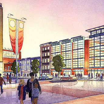A six-phase Master Plan for the redevelopment of Schenectady’s Canal Square Corridor, a few miles from New York’s state Capital. The one million square foot plan introduces major office, retail, entertainment and other smaller components to bring increased activity to the street and re-establish State Street as the vibrant core of downtown Schenectady.