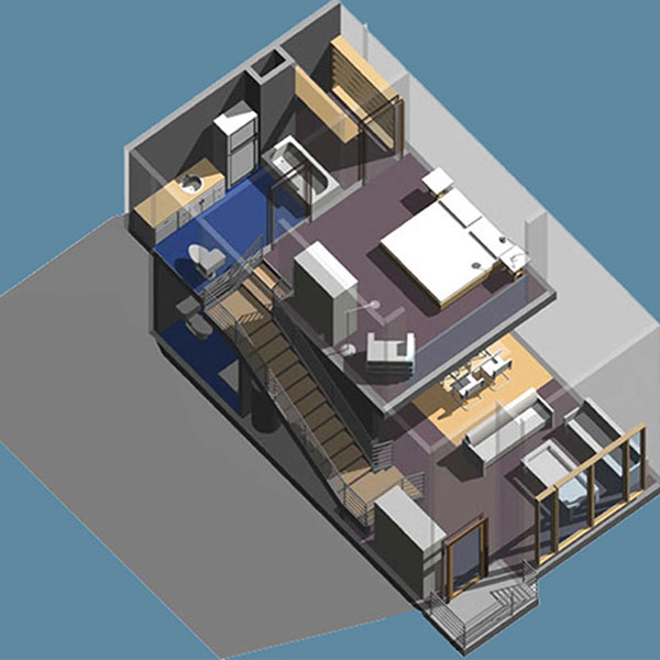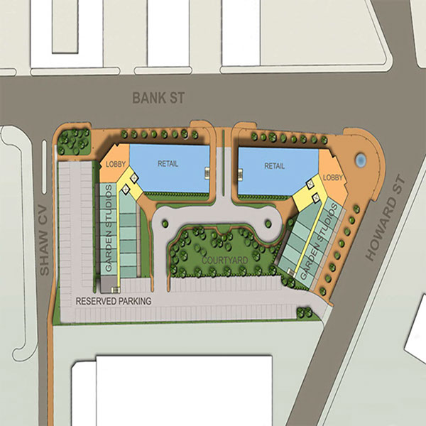 A concept for an urban full-block redevelopment in Downtown New London. Includes 150 residential duplex units on four floors above ground floor retail and parking.