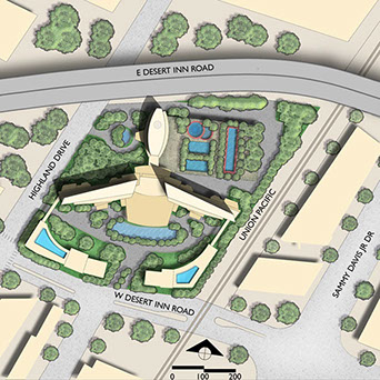 Two 55-story mixed-use resort towers located on the corner of Desert Inn Road and Highland Drive just steps away from the renowned Strip in Las Vegas, Nevada. The hotel program includes 3,500 guestroom keys, along with over 100,000 square feet of retail on the lower levels; 150,000 square feet of ballroom, meeting and event spaces; 50,000 square feet of spa, pool and recreational facilities, and several food and beverage outlets.